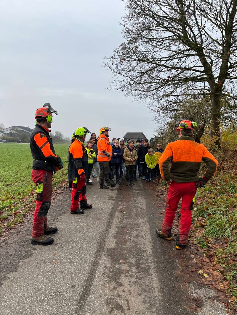 Dafür mussten wir ein Seil um die Bäume wickeln. Zwei Forstarbeiter haben mit Hilfe eines Krans die Bäume ausgerissen. Die Bäume haben wir nachher in den Häcksler reingesteckt. Daraus sind Schnitzel geworden.