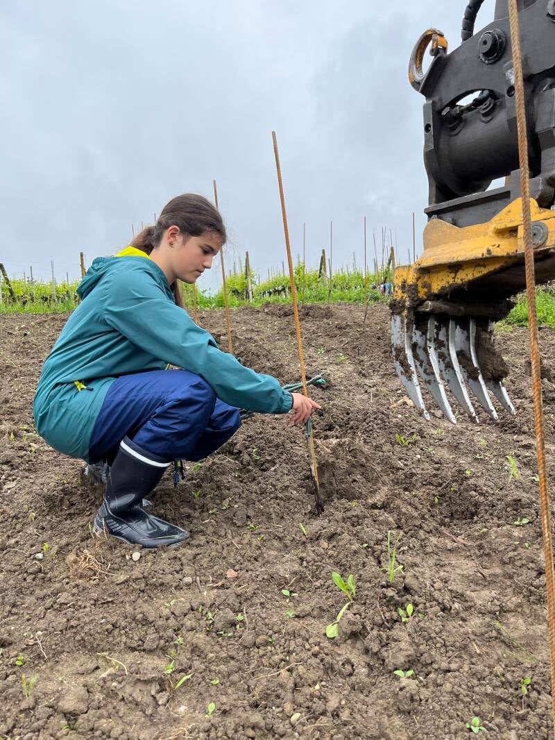 Um zu setzen hat der Bagger die Erde aufgehoben und wir konnten die Reben in den Boden stecken. Danach hat der Bagger den Graben wieder zugeschüttet.